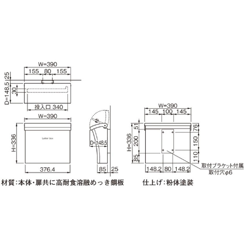 [色]ブラウン [サイズ]H336mm、W390mm、D148.5mm [重量]4.3kg [材質]本体・扉共に高耐食溶融めっき鋼板 [仕上げ]粉体塗装
