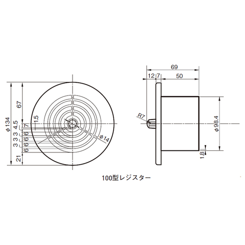 [色]ホワイトグレー [サイズ]筒外径Ф99、外径Ф134 [本体重量]107g [材質]ABS [適用パイプ]SU100 100×106 [有効換気面積]19.8平方センチメートル