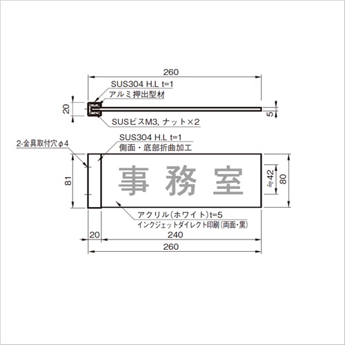 [品番/呼称]TA-248 [サイズ]H80mm、W260mm、D5mm [重量]170g [材質]取付金具:SUS 304、表示板:アクリル(白乳) [仕上げ]ヘアーライン [備考]インクジェットダイレクト印刷