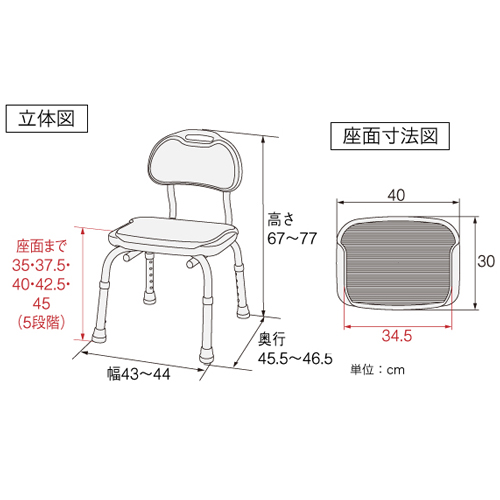 ・浴槽壁にピッタリと横づけできる脚部および脚ゴム形状です。 [色]ブルー [品番/呼称]CPE-N [サイズ]H670〜770mm、W430~4490mm、D455~465mm [重量]3.2kg [材質]座部・背もたれ:PE ソフトパッド:EVA パイプ:アルミ