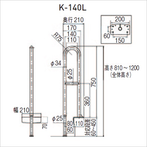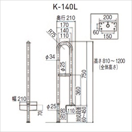 [色]ベージュ [サイズ]H810mm〜1200mm、W210mm、D210mm [重量]3.7kg [材質]本体:スチール[メラミン焼付塗装] 手すり部:ラバーウッド集成材(KM-300L・Fのみ) スライド脚:アルミ [取付可能なかまち高さ]60〜450mm