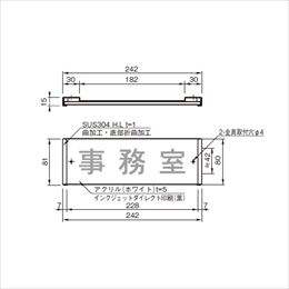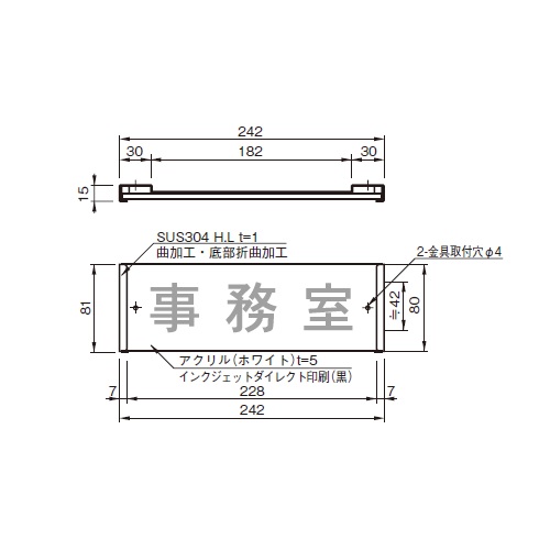 [品番/呼称]HAS-248 [サイズ]H80mm、W242mm、D5mm [重量]280g [材質]取付金具:SUS 304、表示板:アクリル(白乳) [仕上げ]ヘアーライン [備考]インクジェットダイレクト印刷