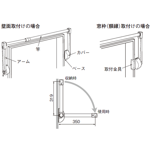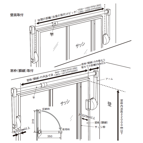・竿の長さ(FPS1350かFPS2000)を選ぶことで、柱間の距離1030〜2000mm、または窓枠(額縁)の内寸法943〜1913mmの範囲で使用可能です。