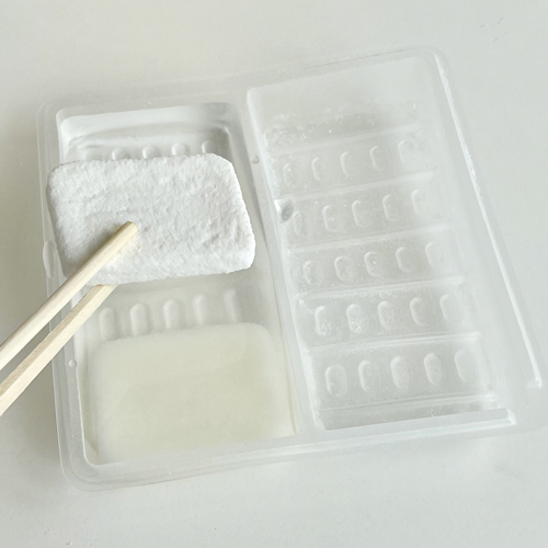 1.トレーの中の乾燥もちをとりだし、外袋へ入れます。 取り出したトレーの片側にアルミ袋に入った水の封を切り、およそ半分の水(約40cc)を入れます。 2.乾燥もちを重ねないように約1分間、完全に水に浸します。(※おもちが水を吸い込んで足りなくなったら、新しくつぎたしてください。) 3.おもち全体に水がしみこんだら、はしでおもちを別皿にうつしてください。添付のきな粉黒みつをふりかけてお召し上がりください。