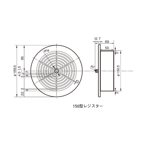 [色]ホワイトグレー [サイズ]筒外径Ф151、外径Ф190 [本体重量]180g [材質]ABS [適用パイプ]エース150 152×160 [有効換気面積]82.02平方センチメートル