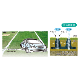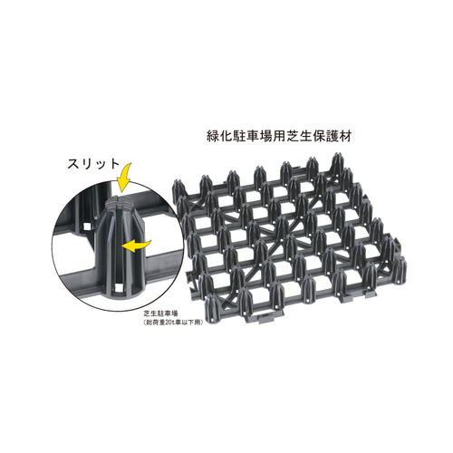 ・緑化駐車場用芝生保護材 です。 ・再生ポリプロピレン100%を使用。 ・支持脚にスリットを追加し通気性を確保。 芝生の育成を促進します。 ・緑被率(保護材露出が少ない)が94%。ブロック・間伐材など(約50%)に対して高く、芝生面積が広くなります。 ・〈エコユニットベース〉の施工された芝生駐車場の区画を表わしたい時にご使用いただく商品です。 平成17年度に、兵庫県でヒートアイランド対策や都市緑化に効果的な緑化駐車場の普及促進を図るため、各種課題を検証する「グラスパーキング(芝生化駐車場)推進事業」が実施され、「エコユニットベース」緑化駐車場もこれに参加しています。 様々な種類の緑化駐車場について、ヒートアイランド対策効果、景観・歩行性、緑化持続性、コストなどを検証した結果、エコユニットベース緑化駐車場は、高い評価を得ています。 [サイズ]525mm×525mm×70mm ・総重量20t車以下用