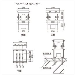 ・コンクリートの基礎を作らず、ベルベースを使うことで簡単に基礎工事が行えます。防水層を傷めない工法で、搬入の負担や音出しも軽減でき、工期の大幅短縮を実現できます。 ・80mmの高さ調整機能付きで、頭部のX軸、Y軸方向の位置調整も可能です。 ・重さは40〜50kgなのでコンクリート基礎の約1/4(180kg規格コンクリートの場合)です。 ・ベルベースの設置後も、一般的な防水層(アスファルト・塩ビシート・加硫ゴムシート・ウレタン塗膜の防水)の復旧が容易に行えます。 ・屋上面の水勾配に対し、頭部の高さ調整及び、水平出しが可能です。 ・太陽光発電設備、空調機器、高圧受電設備キュービクル、風力発電設備、携帯電話基地局、ゴンドラ設備など多種多様の設置工事に対応いたします。 ・内アンカーは、本体内側に4本アンカーを既存防水層を貫通させ施工します。躯体への固定で確実に本体を設置します。 ・外アンカーは、埋込長さ40mmの12本のアンカー(別途)全体で固定強度を確保します。既存防水層を貫通させないで施工します。保護コンクリートへの固定で防水層を傷付けません。 ・大きな荷重に対応した「ベルベースF」、大規模案件に適しコストパフォーマンスに優れた「ベルベースC2」も用意しています。 [サイズ]高さ450〜530mm、頭部340×278mm、底板250×250mm [重量]39kg [材質]スチール [仕上げ]溶融亜鉛メッキ [ご注意] ・水上用(高さ450〜530mm)、水下用(高さ500〜580mm)よりお選びください。 ・納期:ご確認ください。