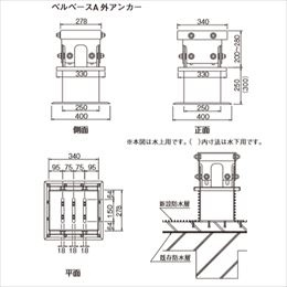 ・コンクリートの基礎を作らず、ベルベースを使うことで簡単に基礎工事が行えます。防水層を傷めない工法で、搬入の負担や音出しも軽減でき、工期の大幅短縮を実現できます。 ・80mmの高さ調整機能付きで、頭部のX軸、Y軸方向の位置調整も可能です。 ・重さは40〜50kgなのでコンクリート基礎の約1/4(180kg規格コンクリートの場合)です。 ・ベルベースの設置後も、一般的な防水層(アスファルト・塩ビシート・加硫ゴムシート・ウレタン塗膜の防水)の復旧が容易に行えます。 ・屋上面の水勾配に対し、頭部の高さ調整及び、水平出しが可能です。 ・太陽光発電設備、空調機器、高圧受電設備キュービクル、風力発電設備、携帯電話基地局、ゴンドラ設備など多種多様の設置工事に対応いたします。 ・内アンカーは、本体内側に4本アンカーを既存防水層を貫通させ施工します。躯体への固定で確実に本体を設置します。 ・外アンカーは、埋込長さ40mmの12本のアンカー(別途)全体で固定強度を確保します。既存防水層を貫通させないで施工します。保護コンクリートへの固定で防水層を傷付けません。 ・大きな荷重に対応した「ベルベースF」、大規模案件に適しコストパフォーマンスに優れた「ベルベースC2」も用意しています。 [サイズ]高さ450〜530mm、頭部340×278mm、底板400×400mm [重量]45kg [材質]スチール [仕上げ]溶融亜鉛メッキ [ご注意] ・水上用(高さ450〜530mm)、水下用(高さ500〜580mm)よりお選びください。 ・納期:ご確認ください。