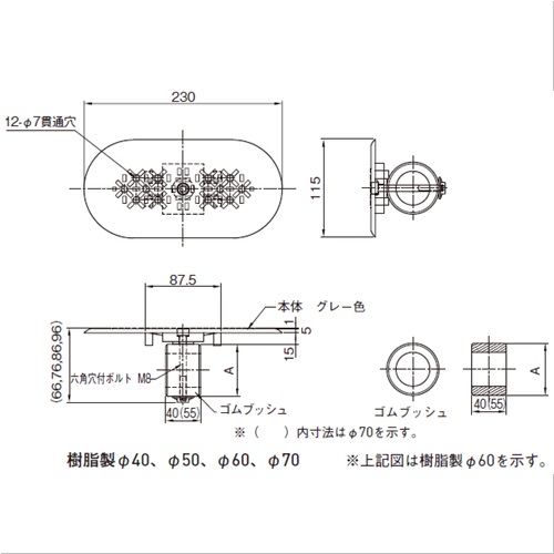 ・コンクリート側溝蓋の手掛け穴を気にせず、安全な通行を確保する手掛け用穴カバーです。 ・通学路や公共・病院・福祉施設まわりの安全な歩行をサポートします。 ・自動販売機を利用時の小銭落下や、砂利・小石の落下を防止します。 [色]黒 [サイズ]W115mm、L230mm、AΦ40mm [材質]TPEE [ご注意] ・側溝蓋の欠損がひどい箇所、側溝蓋の段差が5mm以上の箇所、自動車の通行量が多い所では、ご使用をお控えください。 ・樹脂(ポリプロピレン)製は歩道専用、樹脂製(TPEE)は歩車道兼用です。 ・手掛け穴のサイズを確認してください。 ・仮締め後、穴にセットして、六角レンチにて時計方向にボルトを回し、締め過ぎに注意して本体を固定してください。 ・運搬諸経費は別途お問い合わせください。 ●手掛穴適用幅:40mm〜48mm ●備考:歩車道用