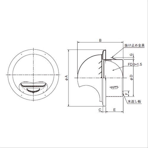 [サイズ]A:117.5、B:105.5、C:6、D:73、E:45、F:16、G:2 [重量]246g [材質]SUS304 [仕上げ]粉体塗装+アクリル焼付塗装(メタリックグレー色) [仕様]網付・FD付 [アミ付]10メッシュ [適用パイプ]SU 75 75× 80 [有効開口面積]13.7平方センチメートル