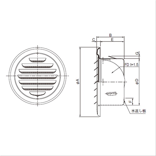 [サイズ]A:118.5、B:52.5、C:6.6、D:73、E:45.9、F:16、G:5.5 [重量]228g [材質]SUS304 [仕上げ]粉体塗装+アクリル焼付塗装(メタリックグレー色) [仕様]網付・FD付 [アミ付]10メッシュ [適用パイプ]SU 75 75× 80 [有効開口面積]13.0平方センチメートル