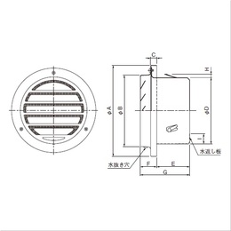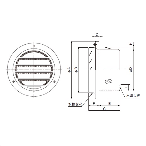 [サイズ]A:133、B:104.2、C:9、D:97、E:47、F:24、G:71、H:5、I:15 [重量]153g [材質]SUS304 [仕上げ]粉体塗装+アクリル焼付塗装(メタリックグレー色) [仕様]網付 [アミ付]10メッシュ [適用パイプ]SU100 100×106 [有効開口面積]26.5平方センチメートル