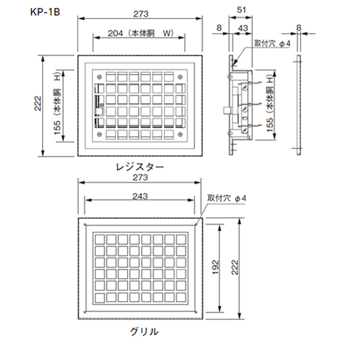 [品番/呼称]KP-1B [サイズ]角型レジスター:H222mm、W273mm、D51mm 角型ガラリ・グリル:H222mm、W273mm、D81mm [重量]1.82kg [材質]スチール [仕上げ]メラニン焼付塗装 [有効換気面積]102センチ平方メートル