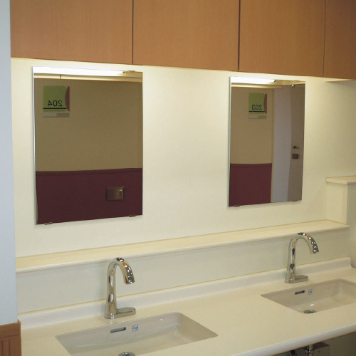 ・割れないため安全で取扱いが容易です。 ・耐用年数が長い為(半永久)、ライフサイクルコスト(※1)に優れています。また、耐寒性に優れているので、寒冷地でも使用できます。 ・ステンレスとポリプロピレンを使用しているため、100%リサイクルでき環境にやさしい商品です。 ・歪み対策として裏打ちをしています。 ・公園、学校、駅など不特定多数の人が利用する場所、障害者福祉施設、特別支援学校、高齢者施設、留置所等でご使用いただけます。