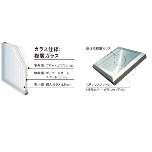 ・ガラスとポリカーボネートの中間層から成る複層ガラスは、光の拡散効果が高く、まぶしさや陰影を抑えたやわらかな自然光が得られます。また、一定の採光量を確保しながら日射熱の侵入を抑制、室内温度の上昇を抑えることができる、トップライトに最適な複層ガラスです。
