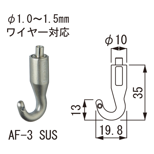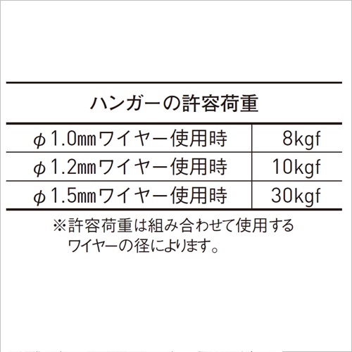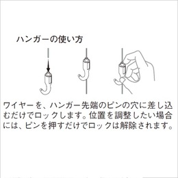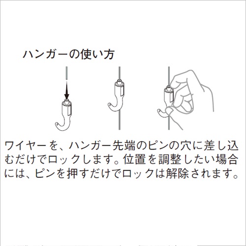 ・展示施設から店舗、住宅での使用に対応した壁面後付け用の中量ピクチャーレールです。化粧カバー付(白のみ)。 ・ハンガーAF-3はグッドデザイン賞を受賞した商品です。 [品番/呼称]AF-3 [サイズ]表記による [材質]ステンレス [ご注意] ・許容荷重30(Φ1.5mmワイヤー使用、ビスピッチ300mm以内) ・許容荷重は正しく施工された場合の1mあたりの荷重です。 ・レールアタッチメントは専用品です。 ・安全のため、本ページ内のレールアタッチメント、ハンガー、ワイヤーを組合わせてご使用ください。 ●ハンガーの使い方 ・ワイヤーを、ハンガー先端のピンの穴に差し込むだけでロックします。位置を調整したい場合には、ピンを押すだけでロックは解除されます。 ●ハンガーの許容荷重 Φ1.0mmワイヤー使用時:8kgf Φ1.2mmワイヤー使用時:10kgf Φ1.5mmワイヤー使用時:30kgf