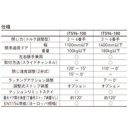 ●閉じ力(トルク調整型):2〜4番手 ●適用ドア(幅):1100mm以下 ●適用ドア(重量):100kg以下 ●左右勝手兼用 ●取付方法:スライドチャンネル ●閉じ速度調整(2弁式):120°〜15°、15°〜0° ●調整式ストップ装置:オプション ●クッションリミットステイ ●最大ドア開き角度(丁番吊ストップ装置なし):約120° ●EN1154準拠(ヨーロッパ規格)