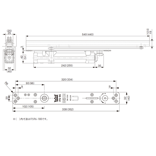 ・室内ドアにご使用ください ・本品使用時は、必ず戸当りを設けてください。 (製品の特性上、最重要項目となります) ・詳細は専用カタログをご覧ください。 ・楕円軌道となる3次元隠し丁番との組合せは避けてください。 ・標準適用ドアの幅、重量でITS96-180の( )内の数字は、ピポットヒンジ吊りの場合です。