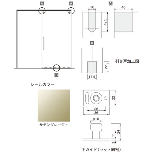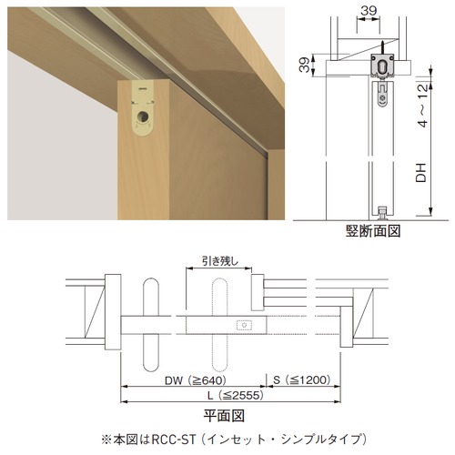 高齢者向けの施設や住宅の木製片引戸にご使用いただけます。 引戸を自然に閉じるセルフクローズ機構を、すべてレールに内蔵しました。 開口部の有効高さを確保しやすくなります。 セルフクローズ機構では開けるときの引っ掛かりがなく、軽い力で開けることができます。 閉じ際およそ300mmの区間でブレーキが作動します。 ブレーキの強弱は調整できます。 引戸を全開にするとキャッチがかかり、開放状態を維持できます。 戸を引くとキャッチが解除されて自動で閉まります。 キャッチの保持力は調整できます。 レールに機構を組み込んでいるため、インセットタイプのRCC-SとRCC-Iは上枠に下からレールを取り付けられます。 吊り込みはワンタッチ式で、ローラー付きの下ガイドをセットに含みます。 レール断面は39×39mmです。 上枠内へレールを納めれば、すっきりした外観を実現できます。 [サイズ名称]L:レール長さ<=2555、DW:戸幅、S:ストローク<=1200、W:枠内開口幅、H:有効開口高さ、DH:戸高さ [本体重量]5kg [材質]アルミ・スチール・樹脂 ●扉重量:30kg以下 ●扉厚:28以上 ●扉幅:640以上・最大ストローク1200まで 【ご注意】不特定多数の方が利用される箇所や、過酷な条件下での使用はお控えください。屋外や浴室、化学薬品を取り扱う場所での使用はお控えください。レールの規格サイズは長さ2555mmです。長さカットと穴加工をしてご使用ください。レールは、2555mm以内でご指定の長さにカットしてお届けするオーダー対応も承ります。別途ご相談ください。戸袋に納めたい場合は、RCC-SHTがございます。