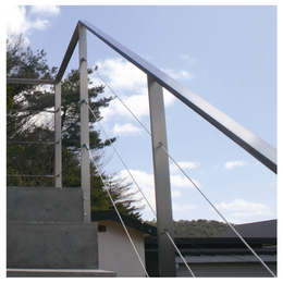 ・現場でワイヤーをカットして挿し込むタイプです。 ・現場で調整できるので、らせん階段や円形のベランダなど寸法測定が困難な場合などに便利です。 ・シンプル形状かつコンパクトなので、視界の邪魔にならず、空間を広く感じさせます。 ・光沢を抑えた上質な質感です。(梨地処理+サーチクロームメッキ) ・作業者が一人でも簡単に取付け可能です。 ・専用スパナとワイヤーカッターのみで簡単に取付けできます。 ・テンションスプリングで弛みの出ない構造で、誰が施工しても強度のバラツキがありません。テンションの調節も簡単に行えます。 ・最長で6mの長さまで取付け可能です。 ・水平・傾斜・壁面など様々な取付けが可能です。 ・ワイヤーにはもらい錆びの被害を受けにくいSUS316を使用しています。 ・専用部品でイタズラによる取外しが困難です。 [品番/呼称]TRN-SR [ご注意] ・各金具の材質はSUS304。本体sRTC、本体sRTS、終端座金D4はSUS303。ワイヤー(7×7)はSUS316です。 ・本体金具を取付ける支柱(フラットバー)は反りを防ぐため丈夫なものにしてください。目安として手摺の高さ1100mmの場合、支柱の厚みは12mm以上にて。 ・ロープテンショナーのワイヤーロープは、片端末ロープです。現場で任意の長さにカットしてご使用いただけますが、必ず片端末ロープをご使用ください。 ・ワイヤーロープ破断強度は、ワイヤー径Φ3(489kgf)、Φ4(834kgf)です。 ・ロープテンショナー基本セットは、ワイヤーロープ径Φ3mmとΦ4mmのどちらかお選びいただき、ワイヤーロープの長さは1m〜6mの範囲で500mmごとに受注承れます。 ・本体取付金具は、ワイヤーロープの径Φ3とΦ4に共通してご使用になれます。 ●セット明細:本体取付用座金A、本体取付用座金B(ボルト付)、スプリングワッシャ、ワッシャ