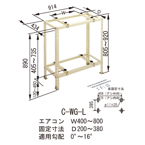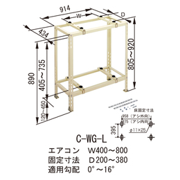 ・エコキュートにも対応します。 ・フレームはワンタッチ組立です。 一段目有効寸法:幅:834、奥行:354、高さ:735 [色]アイボリー [品番/呼称]C-WG-L [サイズ]表記による [重量]11.4kg [材質]高耐食溶融亜鉛メッキ鋼板 [仕上げ]粉体塗装 [耐荷重]80kgf×2