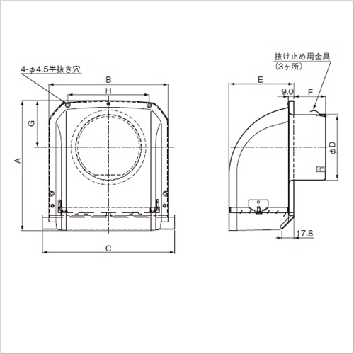 ・コンパクトでスッキリとしたデザインです。 ・新ガラリ構造と折曲げ付のサイドアップ水切板を採用したことで、排気や雨水による壁面の汚れを低減できます。 ・防虫網は着脱可能です。 [品番/呼称]FY-MFA 043 [サイズ]A192mm、B177mm、C195mm、D97mm、E96.5mm、F47mm、G69.3mm、H120mm [重量]240g [ご注意] ・材質:アルミニウム、仕上げ:耐食処理仕上げ(クリアコート)、ブラック塗装(-K) ・FD付・防虫網付機種はメンテナンスが出来る位置にて使用してください。 ・防虫網付は油煙を排気する台所等には目づまりする場合がありますので設置を避けてください。 ・FD付の機種は特定防火設備該当品です。 ・防火ダンパー:公称作動温度72℃(FY-MFAA、FY-MGAA)、120℃(FY-MFAB) ●仕様:ガラリ付 ●適用パイプ(呼び径):SU100 100mm×106mm ●有効換気面積:排気:72センチ平方メートル ●有効換気面積:給気:69センチ平方メートル