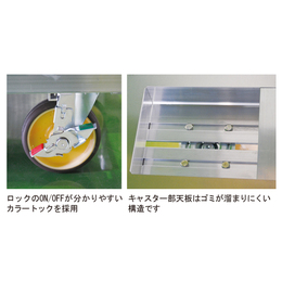 ・最大積載荷重1000kgの軽量アルミです。 ・積重ねできます。 ・大型キャスターを採用(φ150 ウレタン製)してます。 ・キャスターの交換は工具1本で可能です。 ・コーナー部に保護用パッドが付いています。