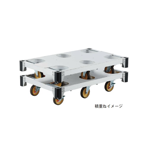 ・最大積載荷重1000kgの軽量アルミです。 ・積重ねできます。 ・大型キャスターを採用(φ150 ウレタン製)してます。 ・キャスターの交換は工具1本で可能です。 ・コーナー部に保護用パッドが付いています。
