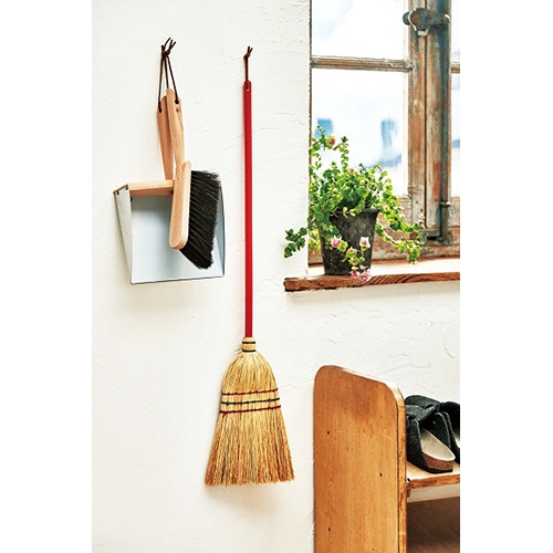 小ぶりなほうきは玄関やベランダでの使い勝手もよく、持ち手の上に革紐がついているため、収納にも便利。