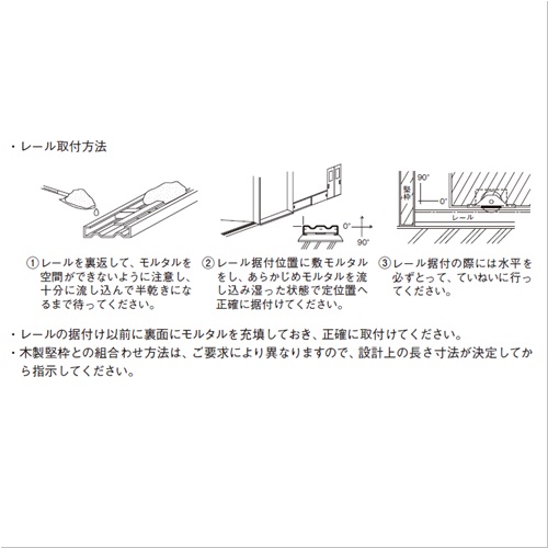 [サイズ]厚み1.2mm、L1829mm [本体重量]2.1kg [付属品]戸車 DPM-0452 ※付属戸車個数はレールの長さによります。 [材質]SUS304 [仕上]ヘアーライン ●備考:幅50片引用、戸車 2 個付 【ご注意】レール取付方法:(1)レールを裏返して、モルタルを空間ができないように注意し、十分に流し込んで半乾きになるまで待ってください。(2)レール据付位置に敷モルタルをし、あらかじめモルタルを流し込み湿った状態で定位置へ正確に据付けてください。(3)レール据付の際には水平を必ずとって、ていねいに行ってください。レールの据付け以前に裏面にモルタルを充填しておき、正確に取付けてください。木製堅枠との組合わせ方法は、ご要求により異なりますので、設計上の長さ寸法が決定してから指示してください。