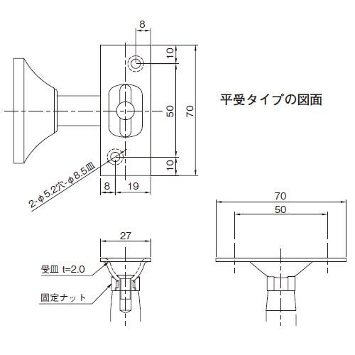 手すりブラケット(支持金具)としてご使用いただけます。 持ち出し方向、10mmの許容範囲で調節可能です。 受皿の角度調節がドライバー1本で容易にできます。 [サイズ]A27mm、B8mm [材質]SUS304 [仕上]ヘアーライン ●パイプ径:平受 ●耐荷重(取付ピッチ900以内):120kgf 【ご注意】ブラケット取付けピッチは、900mm以内としてください。本体を取付座金の軸芯棒に取付ける際は六角穴付止ネジ(付属)2本をしっかり締めてご使用ください。木ネジ用の場合、出幅寸法は通常60 〜 70mmですが、10mmの出幅調整を効かせたタイプで出幅100 〜 110mmのものまで製作可能です。