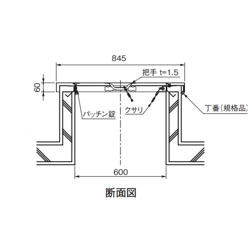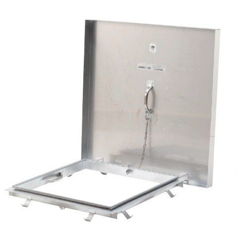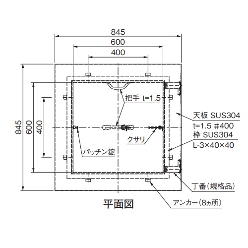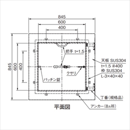 天板(蓋)は、枠に六角ナットとSWで固定されているため取り外し可能です。 枠の四方にパッキンがついています。 [サイズ]845x845x60mm [本体重量]17.6kg [材質]SUS304 [仕上]研磨 公共住宅E-305該当品です。