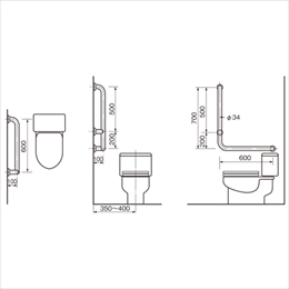 多用途にご利用いただけるL型手すりです。 [サイズ]700mm×600mm×100mm [本体重量]3.1kg [材質]SUS304・軟質塩ビ [仕上]軟質塩ビ被膜 【ご注意】はさみ込み取付の場合に限り、はさみ込み取付部品(別途)が3個必要となります。特注サイズにて製作可能です。
