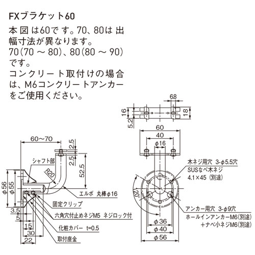 ・コンクリート取付けの場合は、M6コンクリートアンカーをご使用ください。 ・BL認定品としてご利用される場合はブラケットBL-60をご使用ください。