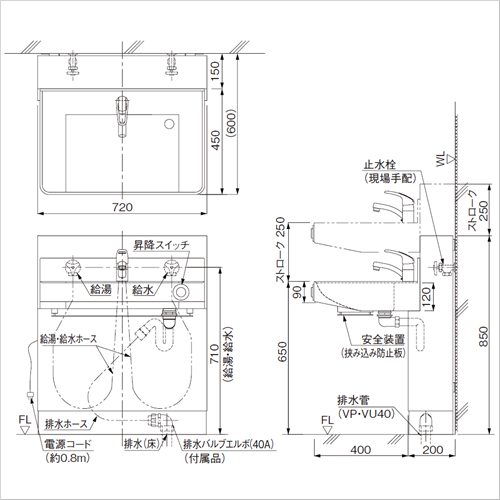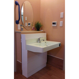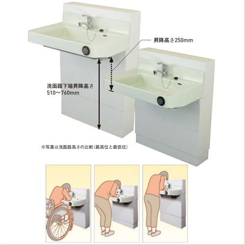 ・ご利用者に合わせて高さを変えられる電動昇降式洗面台です。 ・洗面器の高さは650 〜 900mmまで可動させられます。 ・お子様や車いすを使われている方も楽な姿勢で手洗いや洗顔が可能です。 ・スイッチを指先で軽く押すだけで、静かにスムーズに昇降します。 ・脚部の挟み込みを防止する装置が備えられています。 ・洗面器の上面はコップや石鹸など物を載せやすいように平らな面を多く設計しています。 ・電源は、AC100V 15A 70Wです。アース付コンセント [色]洗面台:ライトグリーン ユニット(昇降部分):白(ホワイト) [品番/呼称]5443-40 [重量]34.5kg [材質]洗面器:FRP カバー:アルミ フレーム:スチール [仕上げ]カバー・フレーム:焼付塗装 [ご注意] ・洗面器、水洗金具、排水金具を含みます。 ・水洗金具は、シングル混合栓です。洗面器、水洗金具、排水金具の仕様は変更できません。 ・施工・工事費については、別途お問い合わせください。 ●洗面器下端昇降高さ:510〜760mm ●昇降高さ:250mm