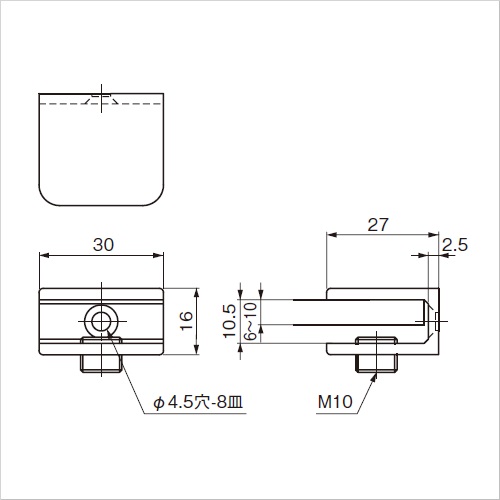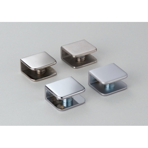 はさみ込みタイプのガラス棚受です。 [本体重量]35g [材質]ZDC [仕上]ダルクロームメッキ [適応ガラス厚]6〜10mm [耐荷重](棚板1枚当り)2kgf
