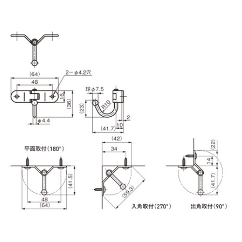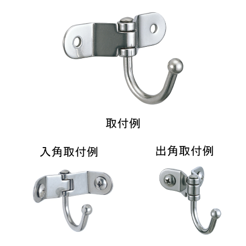 ・内コーナー、外コーナーなどさまざまな場所に取付けることができます。 ・本体は、ヒンジ構造になっており、90°〜270°までの範囲で取付け可能です。 ・フック部が回転しますので、取付ける場所に合わせて柔軟に対応します。 ・フックの先端が球状なので安心してご使用できます。