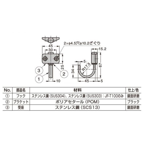 [サイズ]表記による [本体重量]90g [付属品]SUS十字穴付トラスタッピンネジ 4×20 :2本 [材質]SUS303 [仕上]研磨 [吊下荷重]170N(17kgf)