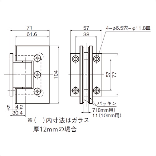 [本体重量]940g [材質]真鍮 [仕上]クロムメッキ [ガラス厚(A)]6,8 [耐荷重]441N/ペア(45kgf/ペア) [最大扉幅]760 [付属品]木ねじ4.8×50/プラグ