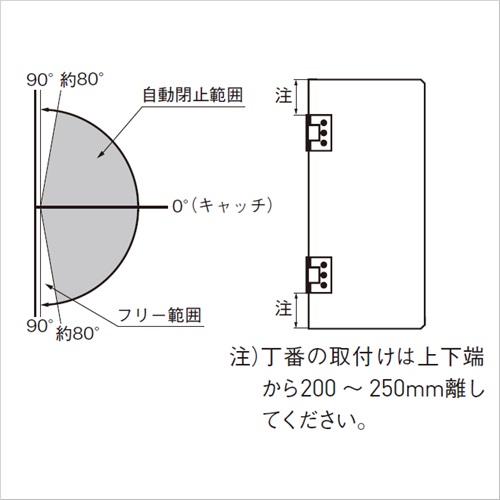 ・シャワーブース仕様で、一日に開閉頻度の多い商業用(店舗間仕切りなど)には不向きです。 ・90°開いた所で扉を止めるストッパー機構は付いていません。90°で止まるように必ず戸当りをご用意ください。 ・2個使い扉高さ1980mm以下にて、3個使い扉高さ2400mm以下にてご使用ください。
