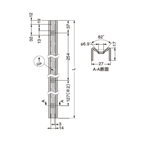 ・棚柱表面には、「UP↑」の刻印がついています。この刻印で上下の確認をして取り付けてください。 ・※2の127は、一番下の取付穴ピッチの寸法です。