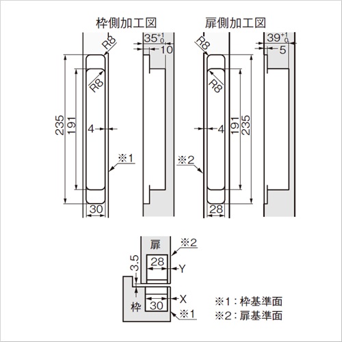 ・取扱い上のご注意を必ずご確認ください。 ・使用するクローザーによっては、動きが悪くなったり、扉が閉まりきらなかったりする場合があります。事前にご確認ください。 ・ストッパー付のクローザーを使用する場合、必ず戸当り(床付、壁付など)を併用してください。戸当りはクローザーのストッパーより先に当たる位置で、扉の中心より戸先側に取り付けてください。