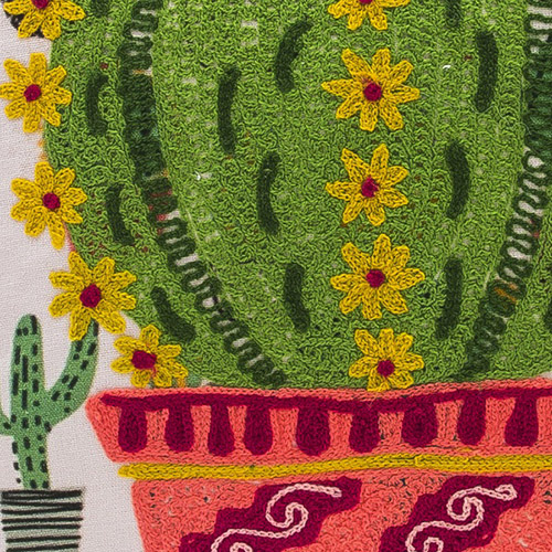 サボテン柄の布地にハンドメイドで丁寧に施された刺繍がポイント。