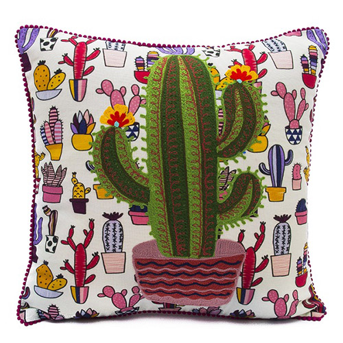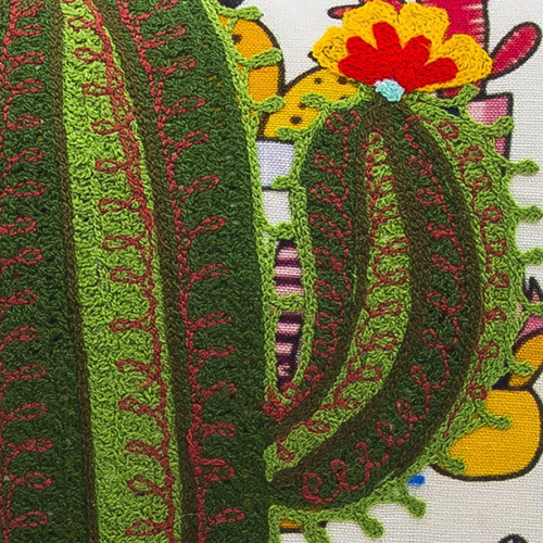 サボテン柄の布地にハンドメイドで丁寧に施された刺繍がポイント。