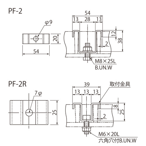 [品番/呼称]PF-2、PF-2R [サイズ]表記による [材質]SUS304 [ご注意] ・前ページのFRPグレーチングFR用の取付・受枠金具です。 ●備考:取付用