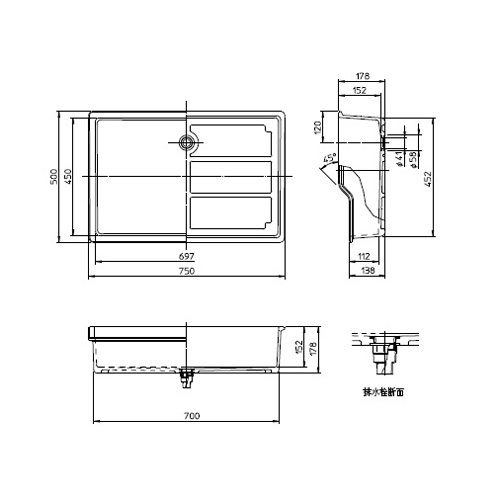 シンプルな形状で、置くだけですぐに使えます。 [色]みかげ [サイズ]750型 [材質]レジンコンクリート [質量]約17kg [容量]約35ℓ [付属品]排水栓1個/ゴム栓1個