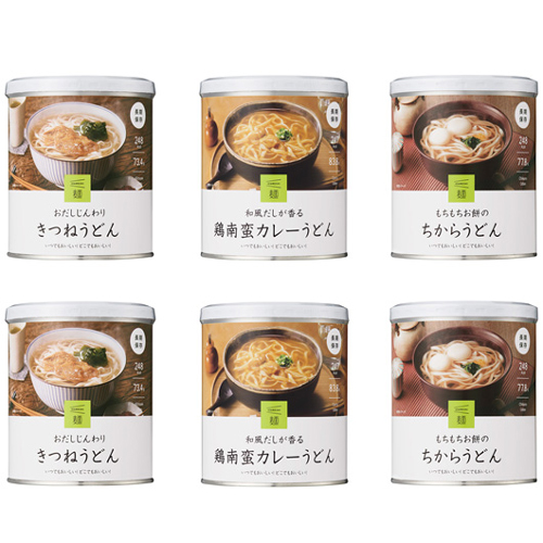 長期保存食「IZAMESHI」の、心まで温まる麺シリーズ。 3種6品をセットにしました。 [箱サイズ]W340×D224×H126mm 1.6kg [セット内容]各2食(3種6品) ・おだしじんわり きつねうどん×2 ・和風だしが香る 鶏南蛮カレーうどん×2 ・もちもちお餅の ちからうどん×2