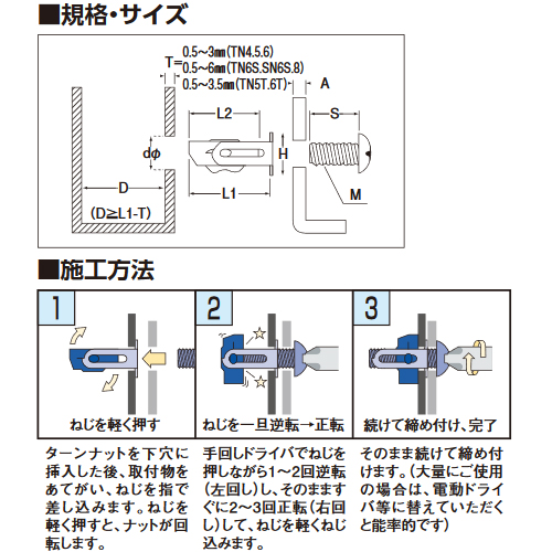 ・手が届かない所へもしっかり締結 ・フランジとナットがひとつになったターンナット ・フランジにねじを差し込むとナットが取り付けやすい状態にセットされ、しっかり締結 ・専用工具が不要なので添付部品としても最適 ・サッシやドア、自動車のボディ等への取り付けにピッタリ