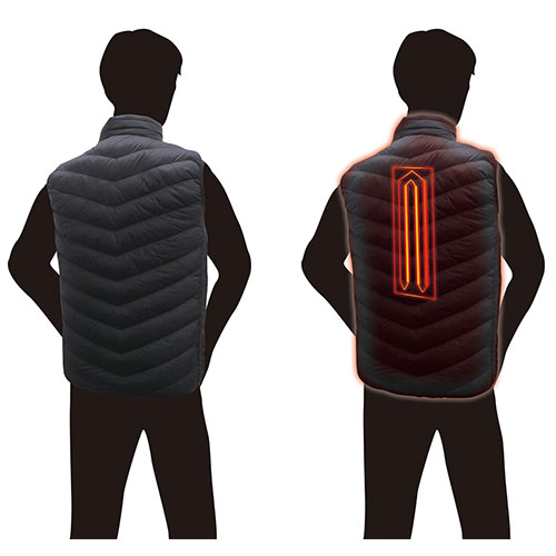 ・背中&脇腹付近にカーボンファイバーワイヤーを内臓。 ・内側はアルミ蒸着ポリエステルで熱を逃しにくい構造になっています。 ・ヒーターとアルミ蒸着で効率的に暖めます。 ・強・中・弱の3段階調整が可能です。