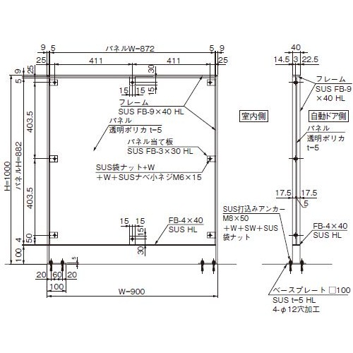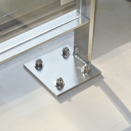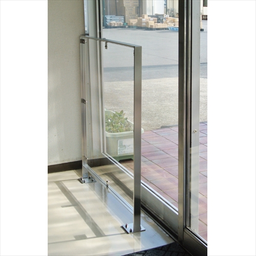 自動ドアに巻き込まれないようにするための防護柵です。 お店、商業ビル、オフィスビルの自動ドアの脇に設置し、自動ドアの安全性を大きく向上させます。 ショッピングカートの突っ込み防止、子供やご年配の方の誤った激突、寄り掛かりによる挟み込みの防止として、ショッピングセンター、複合施設、銀行などでご使用いただけます。 自動ドアの扉が動く際に、扉とフィックスガラスとの間(戸袋)に、人や物が挟まれたり、ドアに衝突するのを防ぐための防護柵です。 人が戸袋側に進入し衝突する事故は、自動ドアを通ろうとしていない第三者が被害者になることがあります。 扉の動きを予想していない、小さな子どもやご年配の方がこのような事故に巻き込まれることもあります。 防護柵の設置は、安心して自動ドアを利用していただくためのものです。 自動ドア設置に関しての安全ガイドラインの1つとして、戸袋側における接触事故の防止策として、防護柵の設置が推奨されています。 自動ドアには複数のセンサーが取り付けられていますが、それらのセンサーは扉を開閉させることを主目的としており、戸袋で人や物が挟まれるのを防ぐためのセンサーが設置されているケースは余りありません。 少ない工具で簡単に取り付けることが可能です。 ベースプレートの位置が偏芯しており、壁際にぴったり寄せて設置できます。 [サイズ]1000x900x100mm [付属品]SUS打込み式オネジタイプアンカー M8×50:8本 SUSワッシャー:8枚 SUSスプリングワッシャー:8枚 SUS袋ナット:8個 [材質]フレーム:SUS304 パネル:ポリカーボネート(クリア) [仕上]ヘアーライン 【ご注意】後付タイプです。ベースプレート方式で、床に対してアンカーを打ち込んで設置します。